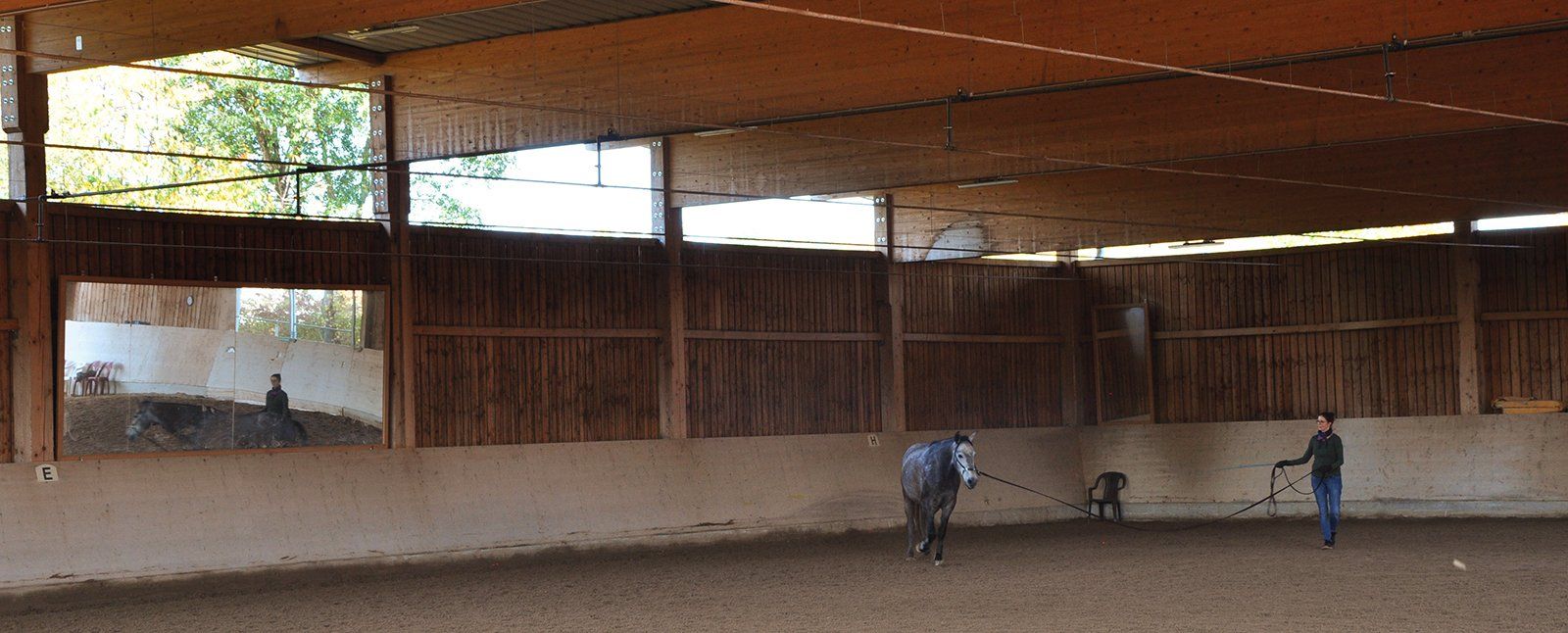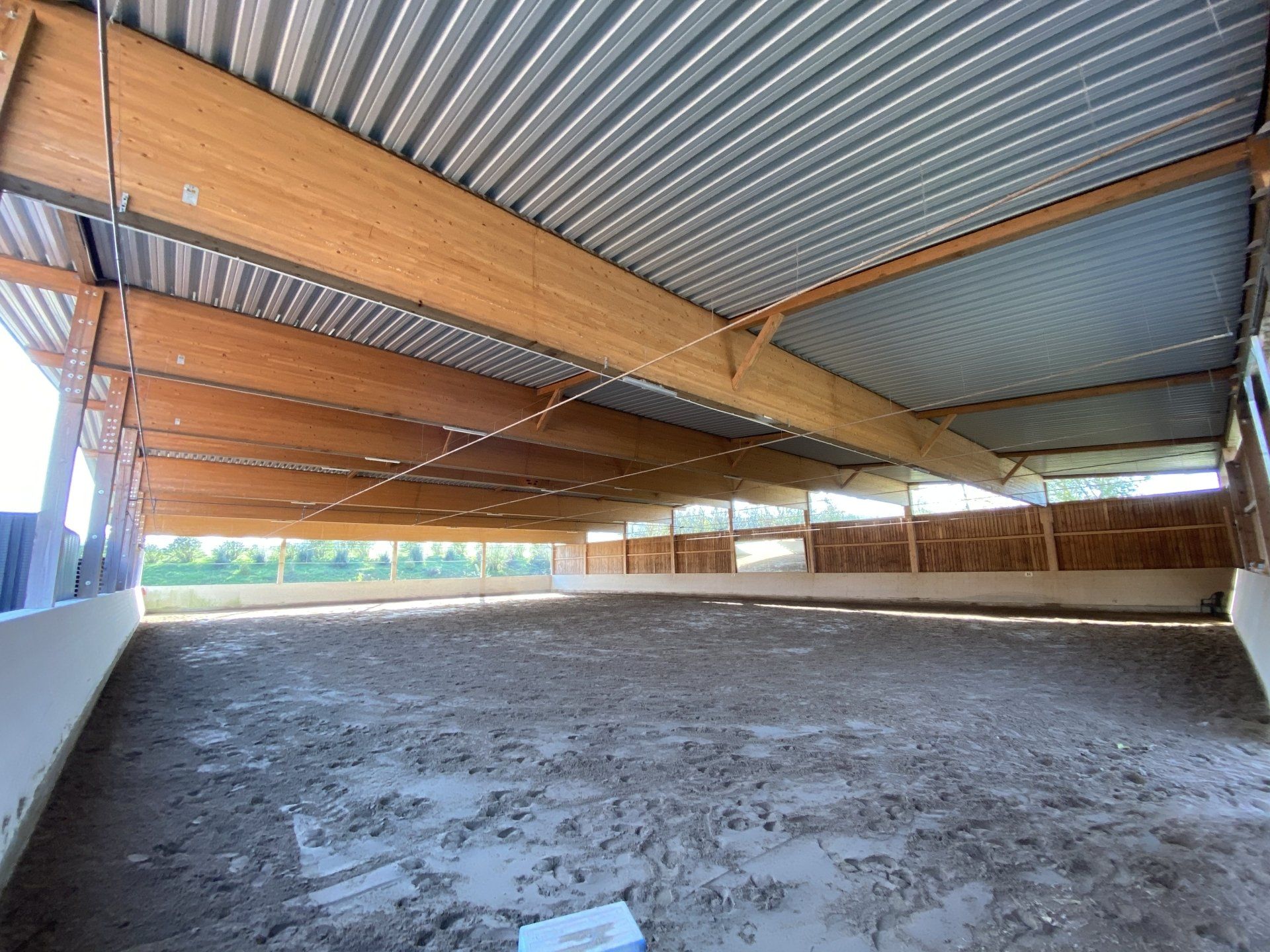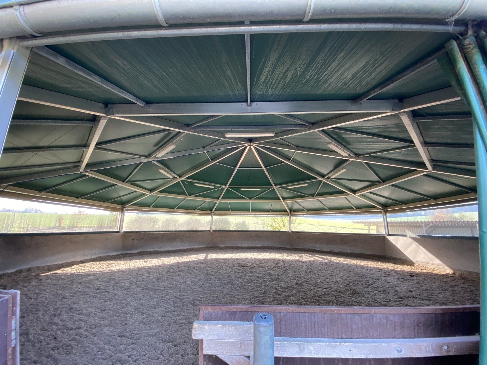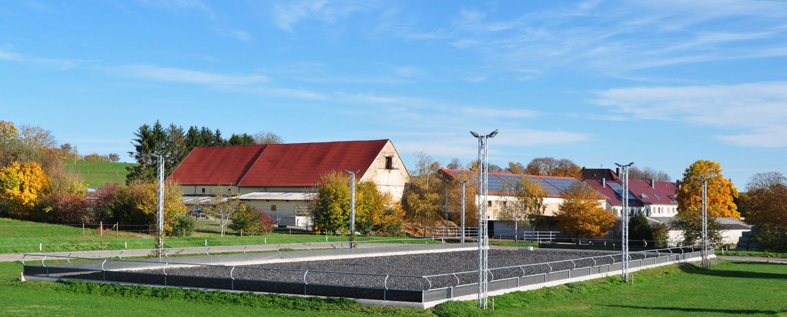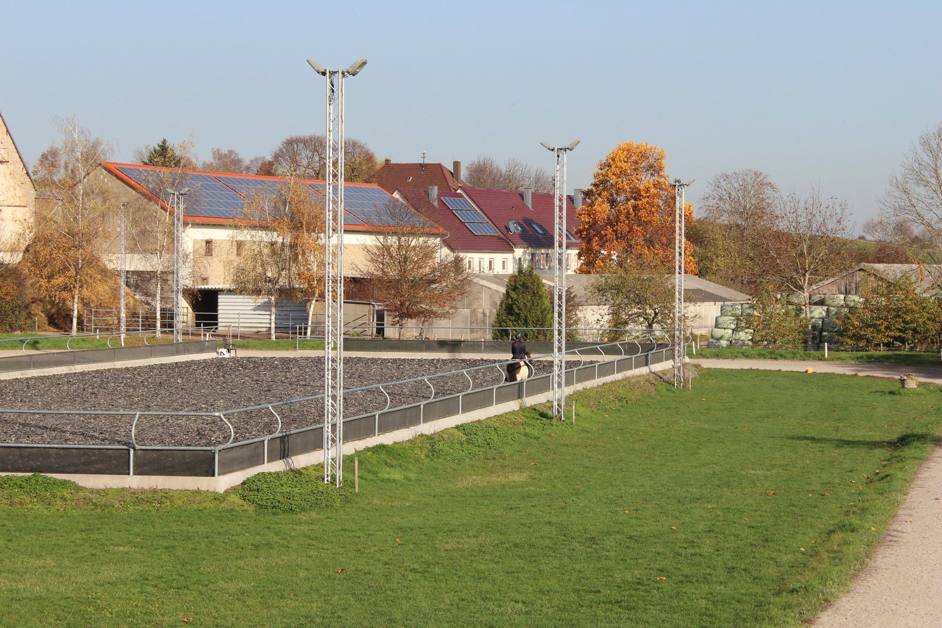 Der Dressurplatz 20 x 60 m mit Flutlichtbeleuchtung